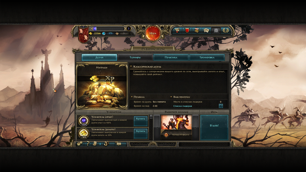 Duel of Champions — карточная стратегическая онлайн-игра, события которой разворачиваются в легендарной вселенной Might & Magic®. Начните свой путь с выбора одной из знакомых по классическим «Героям» фракций: Альянс Света, Некрополис и Инферно. Стороны представлены набором из нескольких сотен уникальных карт (включая коллекционные экземпляры), комбинируя которые, вы сможете получить собственную непобедимую армию.